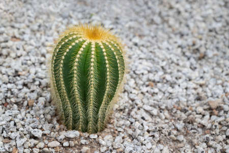 Close-up of Parodia cactus (Eriocactus), a succulent plant with a green stem, round-shaped, and yellow spines decorated with white small pebbles in the rock garden. Free space for text.
