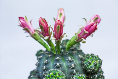 Cactus plants are blossoming on a white background.