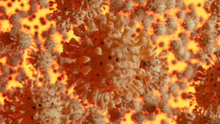 Coronavirus outbreak, COVID-19 under microscope. Danger virus background. 3d rendering.