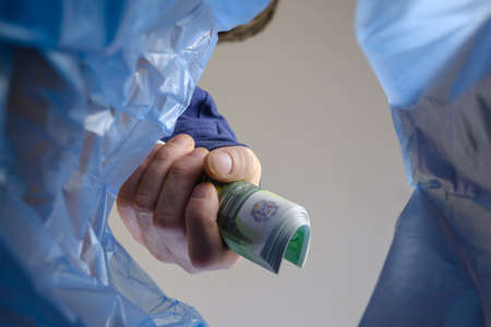 Hand giving money like bribe or tips isolated on banknotes background. EURO and USD currency banknotes close up. Reward for hard work, inflation, finance and business concept