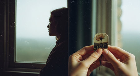 A young woman looks through the window and holds a flower in her hands.