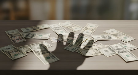 Scattered US dollar bills of various denominations lie on a wooden table, with the ominous shadow of a hand reaching over them. The concept suggests greed, theft, debt, financial struggle, or the intangible nature of money.