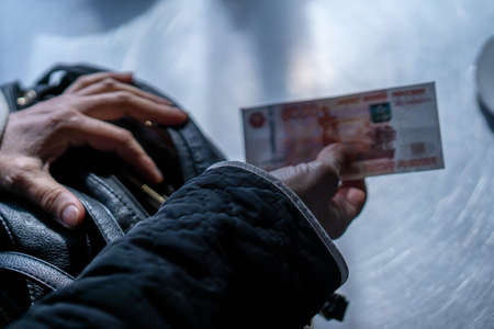 The hand throws money in the trash. A man is holding several Russian rubles over the trash garbage can. Inflation, bankruptcy, obsolete money concept. Bottom view.
