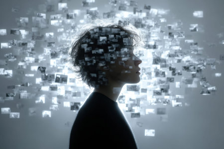 A young woman stars intently at the viewer, her face adorned with small photographs, creating a collage that reflects various moments.