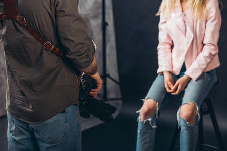 Photo camera in the hands of a man professional equipment hobby Creative approach studio cropped view