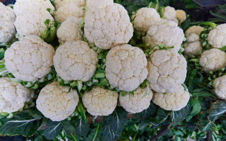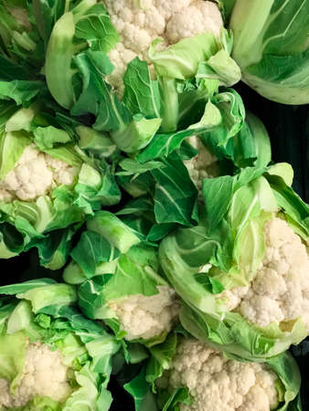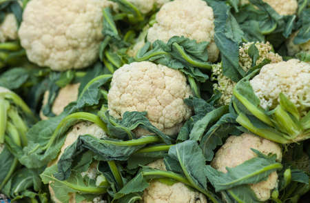 Fresh white cauliflowers piled on the market stall. Vegetable background