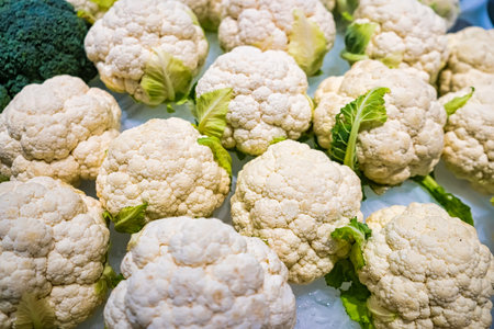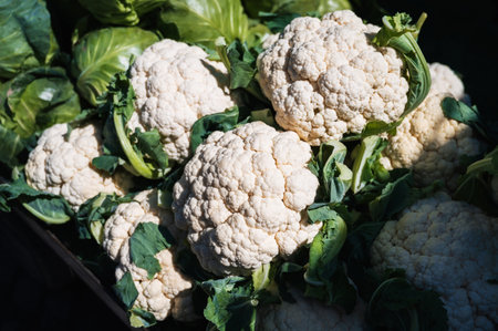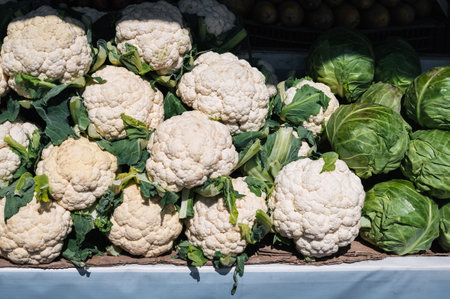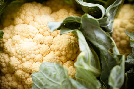 harvest of fresh cauliflower on the counter at farmers market