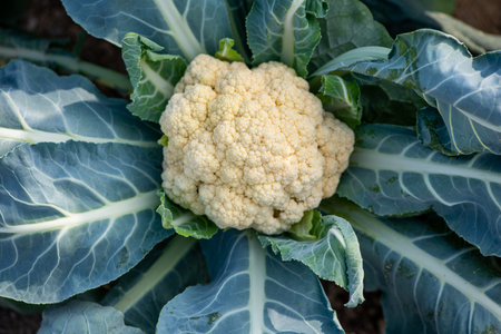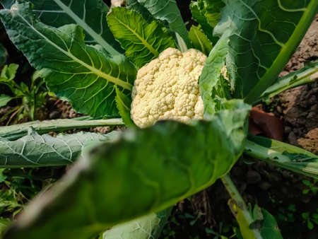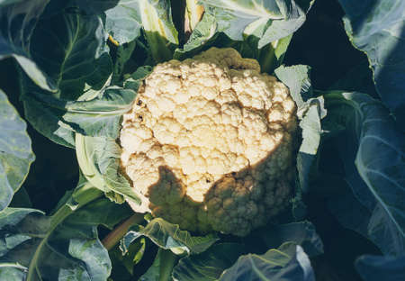 Fresh raw cauliflower in the garden close up