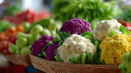 A vibrant collection of fresh cauliflower in various colors showcased in a rustic basket, surrounded by an abundance of colorful vegetables, highlighting healthy eating.