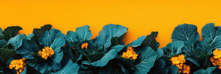 Colorful flowering cabbage plants showcase their beauty against a bright yellow background, highlighting the rich hues in full bloom.