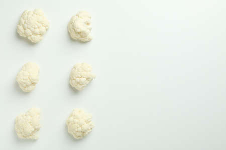 Top view of freshly cut cauliflower florets arranged on a white background with plenty of space for text.