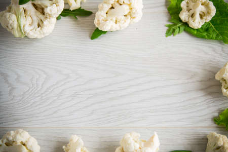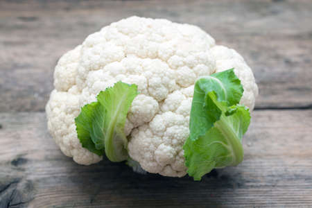 Raw, fresh organic cauliflower on a wooden background. Healthy eating, low carb diet concept