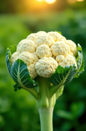 Close-up of a cauliflower plant growing in a field, backlit by the warm glow of the setting sun, showcasing the vegetable's vibrant green leaves and textured white head