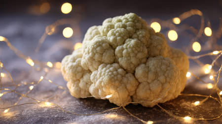 Cauliflower sits elegantly on a surface surrounded by twinkling lights creating a warm and inviting New Year atmosphere.