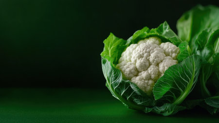 A head of cauliflower is sitting in a green leafy vegetable. The cauliflower is the main focus of the image, and the green leafy vegetable is the background. Concept of freshness and health