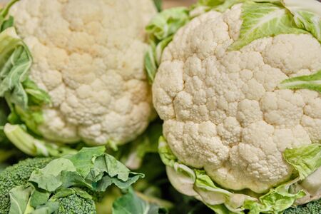 Ripe fresh cauliflowers, background close up