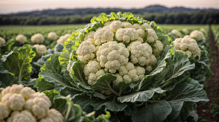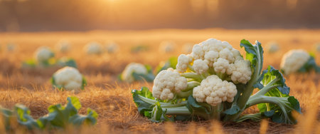 AI Generated. Freshly harvested cauliflower in a sunny field during sunset