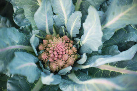 Fresh organic Purple cauliflower and Roman cauliflower on display at the local farmers market