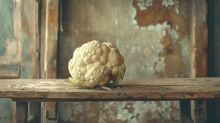 A solitary cauliflower rests on a rustic wooden table, dominating the frame.
