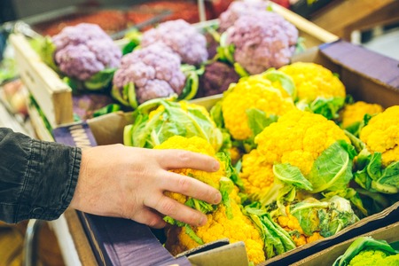 organic white cauliflower on sale in the grocery stall in winter