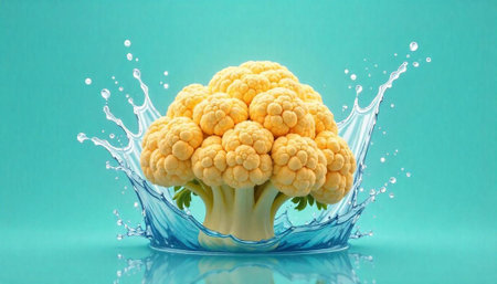 Yellow cauliflower with water splash on blue background studio