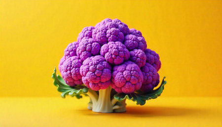 Vibrant purple cauliflower on a yellow background studio shot