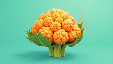 Orange cauliflower with green leaves on a teal background