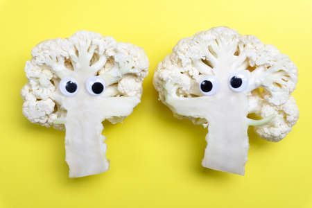 Funny food concept. Cauliflower vegetable on yellow background. Food for kids