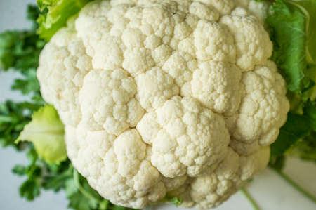 White cauliflower from ecological agriculture over parsley background. overhead shot