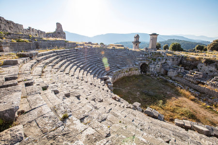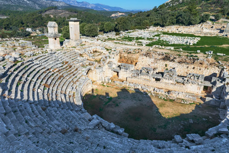 Amazing view of theatre of Xanthos ancient city - part of Lycian way. Tomb monument of king Kybernis ( Harpy Tomb), Pillar Tomb on background. Popular travel destination in Antalya, Turkey