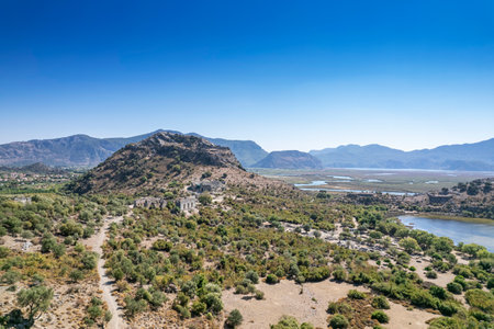 Turkey touristic area Dalyan Ortaca, Kaunos rock tombs in Dalyan, ancient city of Kaunos, Dalyan valley, Turkey. Caunos (Latin: Caunus) was a city in ancient Caria and Anatolia.