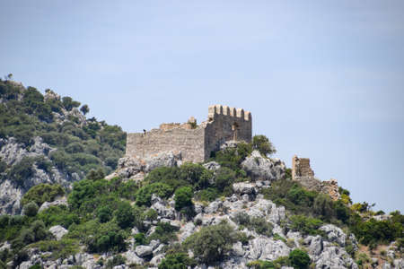 The ruins of an ancient fortress on top of a cliff. Kekova Turkey city ruins.
