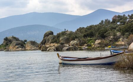 Azmak River, Akyaka, Mugla, Turkey. Nature composition. Summer Background. Countryside landscape with lake. Boat sails on the Azmak River. People are taking tour on Azmak River in Akyaka Village.