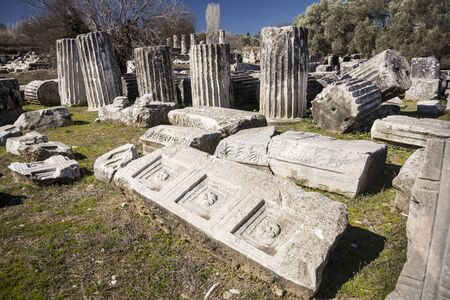 View of Apollon Temple in Didyma Ancient City in Ayd?n Turkey, on cloudy blue sky bakcground.