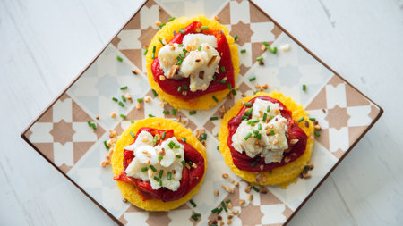 Cod skewer with red pepper and polenta. Traditional tapa from the Basque Country.