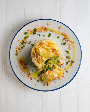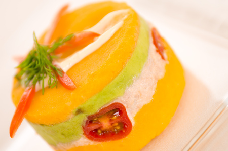 Typical Peruvian dish called causa rellena, which is served as a starter.