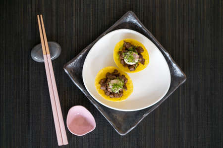 Asian style meat tartlets on white plate with wooden chopsticks on black mat in Japanese restaurant. close up, photo for the menu