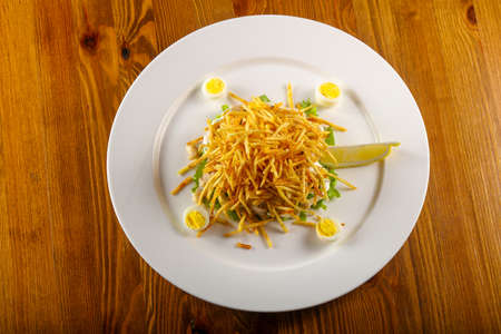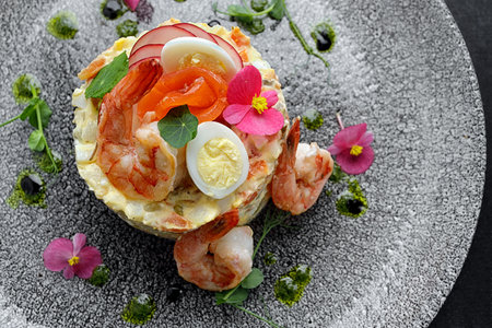 Olivier salad with shrimp, salmon and quail eggs on a plate