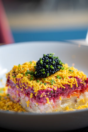 Close-up of a colorful layered herring salad topped with black caviar and garnished with chives in a white dish.
