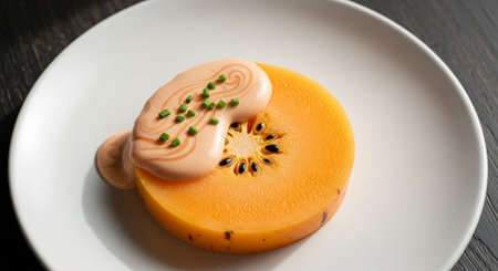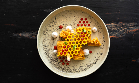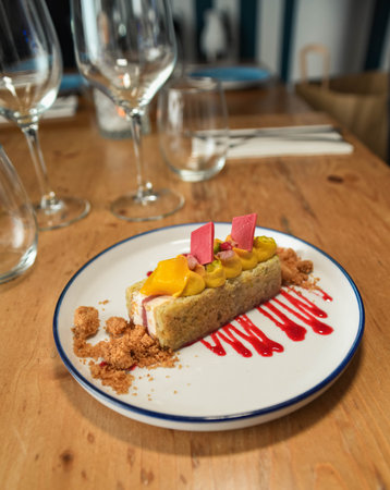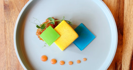 Geometric gourmet dessert on modern plate, featuring colorful