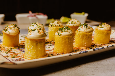 Spanish tapas with mango and cheese on a white marble table Sea food ceviche Assorted food plates Peru traditional comfort food buffet table