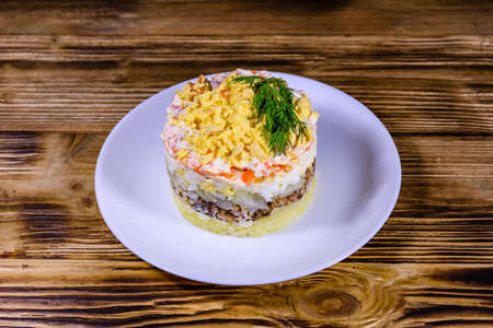 Plate with traditional russian salad Mimosa on wooden table. Layered salad with potatoes, sardine, cheese, carrot, eggs and mayonnaise