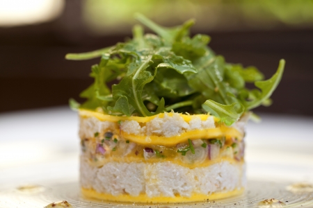 Appetizers with flaked crab, mango slices and arugula salad