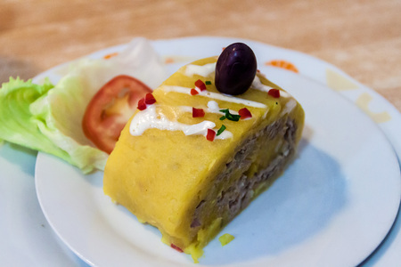 Traditional Peruvian dish called Causa made of mashed potato with aji (hot pepper) and lime juice and filled with vegetables (corn, peas, carrots) and mayonnaise