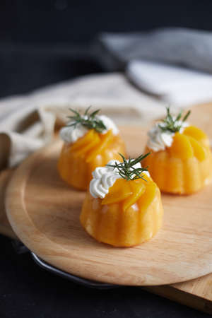 Delicious slice of yellow mango cake or fruit cake mango cake in sweet buffet