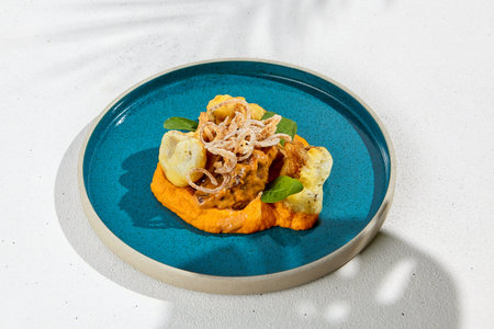Beef cheeks with gravy on vegetables mashed. Main course - srew beef with pumpkin mash and crispy onion rings. modern food. Fusion cuisine