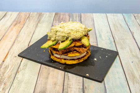 Layered Venezuelan corn chapata with shredded care, fresh cheese, avocado and queen pepiada filling on top with grated cheese