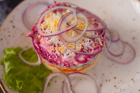 Homemade dressed pickled herring, traditional russian layered salad herring under a fur coat.
