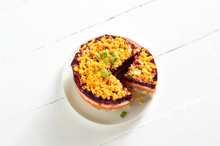 Shuba salad. Dressed herring, herring under fur coat. Christmas layered vegetable salad with herring and boiled vegetables. White wooden background, close up view