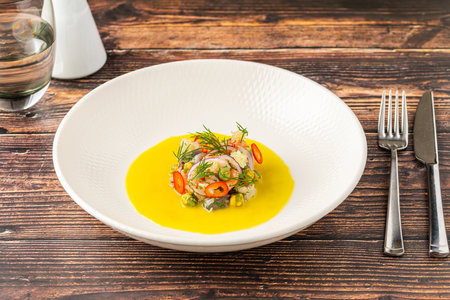 Fresh ceviche with citrus olive oil and colorful garnish
